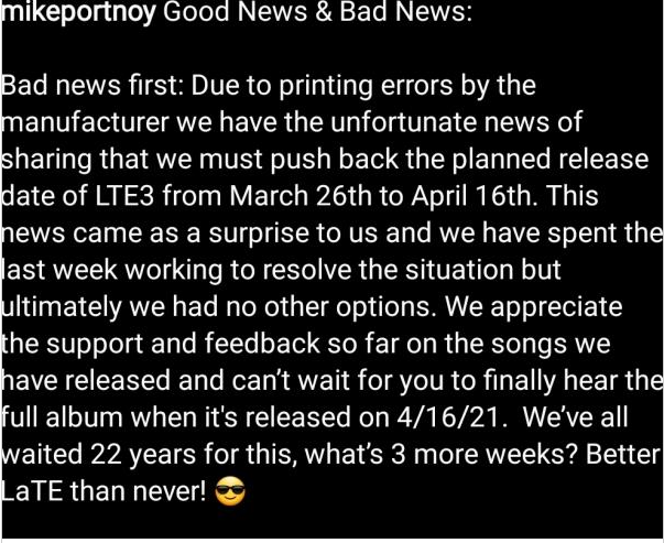 Today I found out that due to printing errors the new LTE record got postponed to April 16th. when I found it I got super mad because i was waiting and i have already heard everysingle song and part by Liquid Tension i really wanted them to release new matirial as soon as possible. I know its only 3 week postpone but its still really annoying
