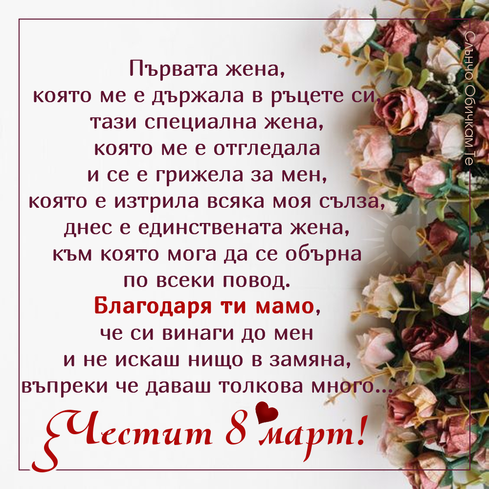 Мила моя,мамо!Благодаря ти за всички грижи,които си положила за мен и продължаваш да полагаш!Благодаря ти,че винаги си била моята най-добра приятелка и все още си!Благодаря ти,за всичко!Продължавай да бъдеш строгата мама,което си ти е чара!И един съвет от мен,пази си нервичките за след време!Обичам те!