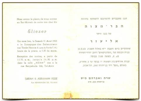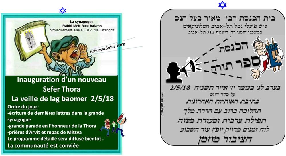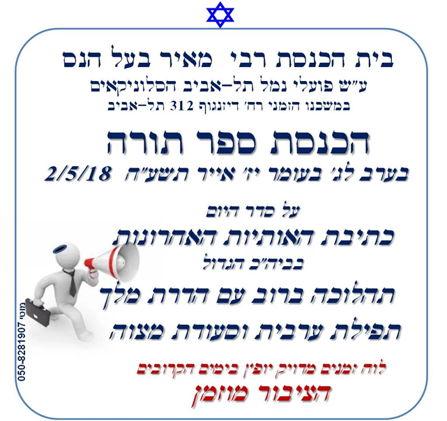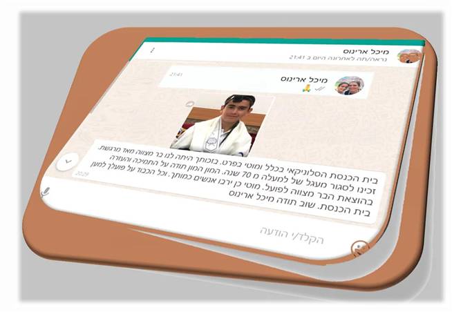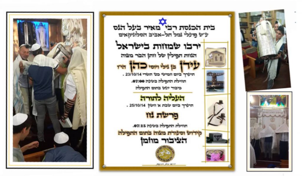 ביום שבת כו’ ניסן תשע”ז 22/4/17, (פרשת שמיני) ערך התלמיד הנעים אייל בן סמדר ישראל את העליה לתורה שלו בבית הכנסת שלנו בהשתתפות עשרות רבות של אורחים. אייל, הוא נכדו של זקן המתפללים דוד-חי ישראל הי”ו. בית הכנסת המה עשרות רבות של מתפללים, בני משפחה, מכרים וחברים אשר באו לחגוג את שמחתו של אייל. הקריאה בתורה הייתה בטוב טעם ובאופן מרשים וטביעת אצבעו של מורהו החזן והפייטן יעקב מזרחי ניכרה היטב. אייל, קיבל תעודה המציינת שחגיגה זו נערכה בבית הכנסת הסלוניקאי וכן הוא קיבל במתנה סידור תפילה, סדר הקידוש וספר תהילים. בתום התפילה נערכה סעודת מצוה בה השתתפו האורחים הרבים שבאו לחגוג עם אייל, נער הבר-מצוה.