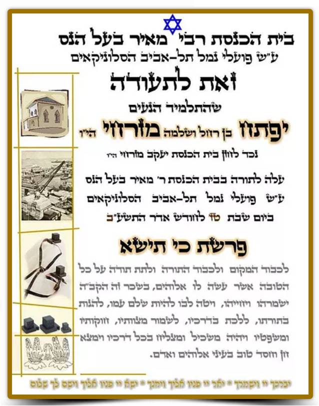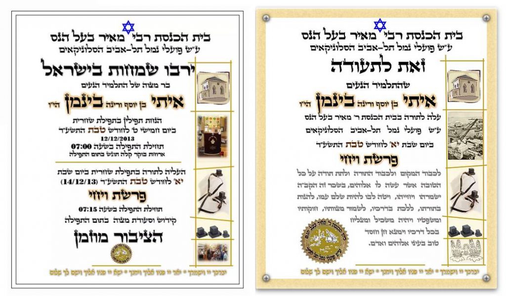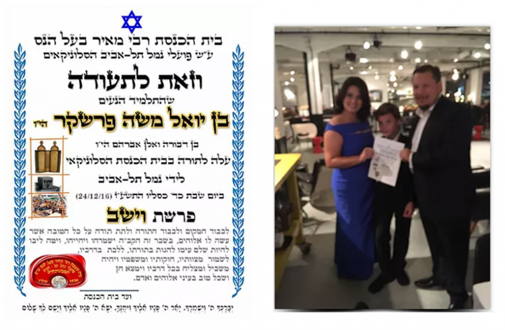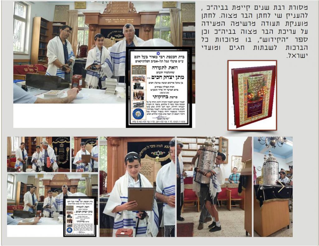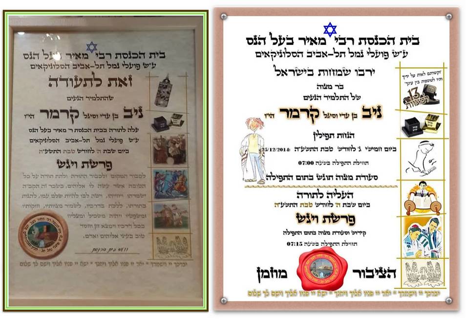 מסורת רבת שנים נוספת הנהוגה בבית הכנסת היא להעניק לתלמיד הבר מצוה תעודה מהודרת המעידה על עריכת הבר מצוה, הנחת התפילין והעליה לתורה בבית הכנסת על שם פועלי נמל תל-אביב הסלוניקאים. בנוסף, הענקנו לאיתי שי נוסף, ספר הקידוש בו כל הברכות הנהוגות בשבתות, חגים ומועדי ישראל. בתמונה, תוכלו להתרשם מהתעודה המהודרת שהוענקה לאיתי.