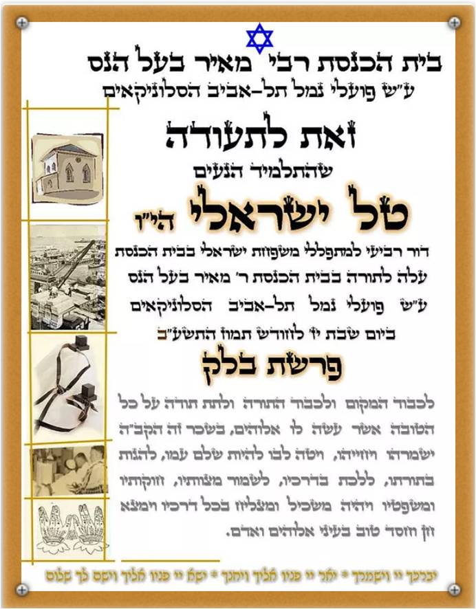 תרצ”ו 1936 – הקמת נמל תל-אביב והקמת ביה”כ על ידי קבוצת פועלים ספרדים סלוניקאים 80 שנות פעילות רציפה ברוח מסורת ישראל סבא