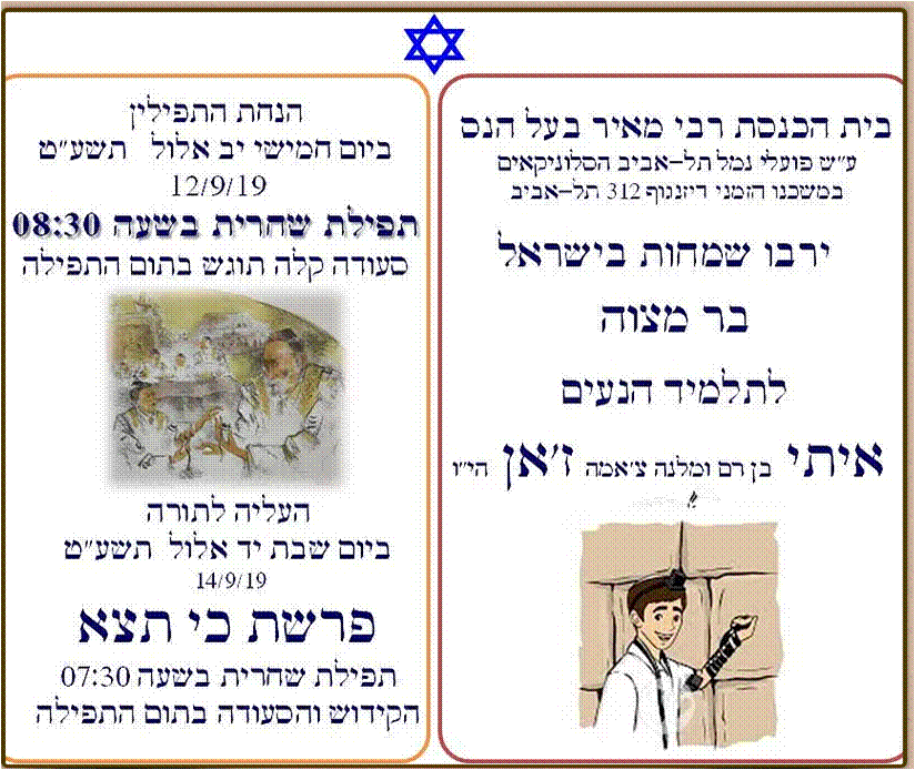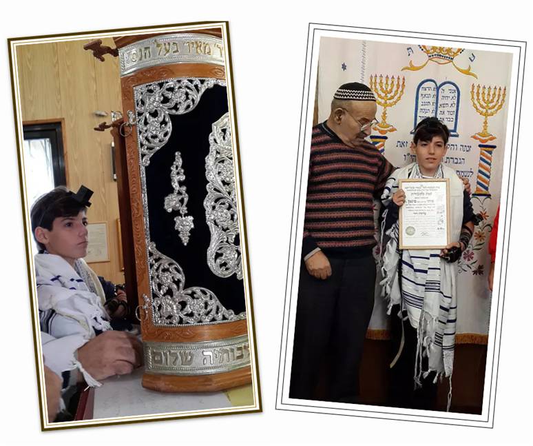 איתי בחר בבית הכנסת הקטן שלנו לערוך את הבר מצוה שלו וביום חמישי בשעה 08:30 התכנסו בני משפחה נרגשים עם ציבור מתפללי בית הכנסת ובתפילת שחרית חגיגית הניח איתי לראשונה תפילין לאחר שלמד אצל הרב יגאל בן דוד הי”ו. ביום שבת עלה איתי לתורה בפרשת “כי תצא”, פרשה המשופעת במצוות ובתקנות הרלוונטיות ממש עד היום.