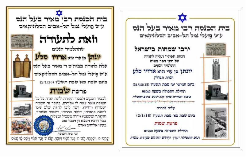 ביום שבת כד’ כסלו תשע”ז 22/12/16, (פרשת וישב) ערך התלמיד הנעים בן יואל משה פרשקר את העליה לתורה שלו בבית הכנסת שלנו בהשתתפות עשרות רבות של אורחים. הקריאה של בן בתורה הייתה מרשימה. הוא קרא את כל הפרשה בטוב טעם ובאופן מרשים. בן קיבל תעודה המציינת שחגיגה זו נערכה בבית הכנסת הסלוניקאי וכן הוא קיבל במתנה סידור תפילה וספר תהילים.בתום התפילה נערכה סעודת מצוה בה השתתפו האורחים הרבים שבאו לחגוג עם בן.