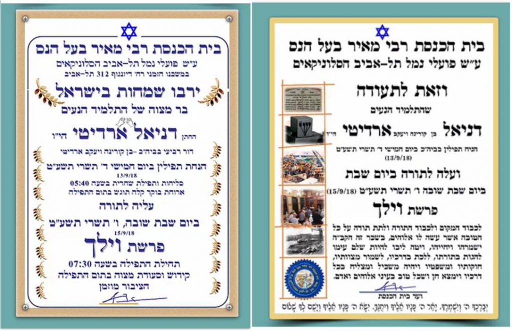 ביום חמישי ד’ תשרי תשע”ט הניח התלמיד הנעים דניאל בן יעקב וקורינה ארדיטי, תפילין בבית הכנסת ומיד לאחר מכן בשבת שובה פרשת וילך ו’ תשרי עלה לתורה.דניא ל, דור רביעי ליוצאי סלוניקי בבית הכנסת, הסבא רבה יעקב חנדלי בן שרה, היה מראשוני המתפללים וסבו אדי הוא מוותיקי בית הכנסת ואביו יעקב, פוקד את ביה”כ ואחד מתומכיו. קריאת התורה של דניאל הייתה מרשימה ביותר. קריאה חדה וברורה ובביטחון עצמי מרשים, ללא ספק מורו ורבו ר’ יעקב מזרחי היטיב ללמדו את מלאכת קריאת התורה.