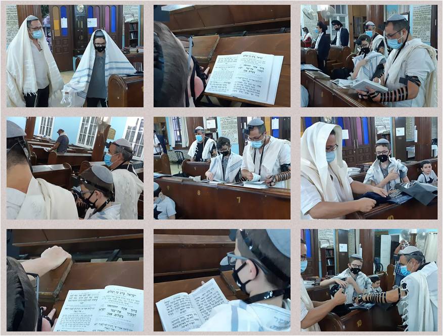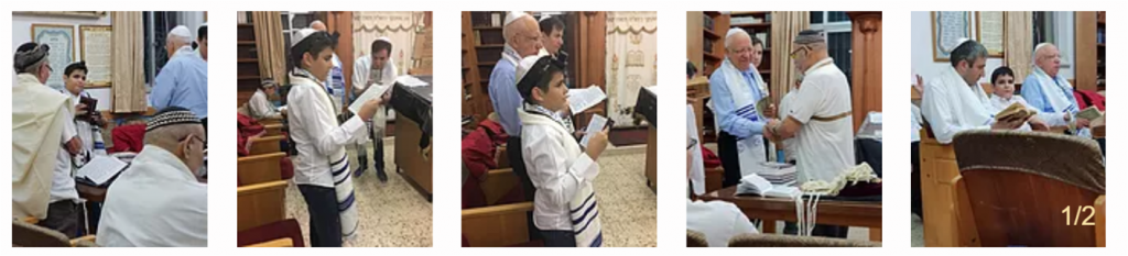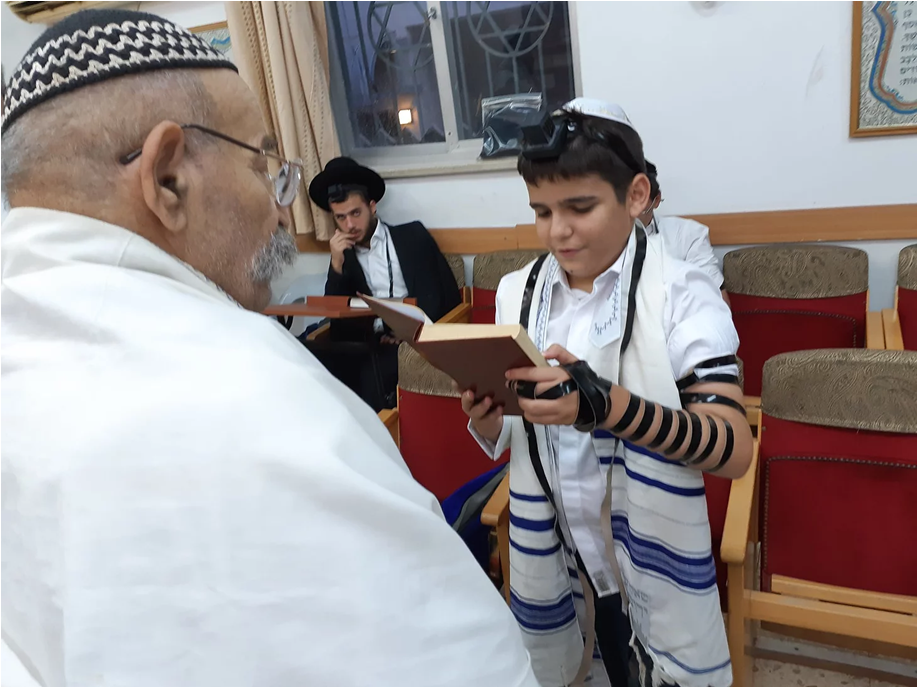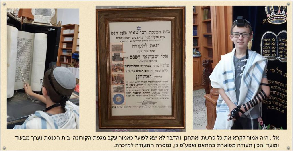 אלי שבתאי, תלמיד נעים הליכות עם חיוך תמידי הנסוך על פניו, נמנה על המתפללים הקדטים הותיקים של בית הכנסת על אף שהוא מתגורר בחדרה. בכל פעם שאלי, הוריו ואחיו מבקרים את הסבא, שבתאי המתגורר בסמוך לביה”כ מתייצב אלי בביה”כ ונמנה הוא על משכימי הקום. אלי מסייע בכל ההיבטים הקשורים לעריכת סעודת הקידוש הנערכת מדי שבת ושבת, עורך את השולחנות, מגיש ודואג בארגון כל פרט ופרט כשאחיו מסייע לו במלאכה זו. היה ברור לכולנו שאת חגיגת הבר מצוה והעליה לתורה יחגוג אלי אצלינו בביה”כ. עוד בשנה שעברה פנה סבו שבתאי מבאי בית הכנסת הקבועים על מנת לתאם ולקבוע מועד לחגיגה זו, בשבת פרשת ואתחנן. מגפת הקורונה טרפה לכולנו את הקלפים. המגבלות שהוטלו על הציבור בכלל ובתי הכנסת בפרט הטילו צל של ספק על אירוע מתוכנן זה ואכן, המגבלה האחרונה שהטיל משרד הבריאות על מספר המתפללים המותרים, 10 במספר הביאה להחלטה על לביטול שבת הבר מצוה שתוכננה כאמור לשבת פרשת ואתחנן. אבל לא כאלי שיוותר. ביום רביעי ח’ אב, התכנסנו באולם של בית הכנסת הגדול עם מספר מתפללים מבאי בית הכנסת שלנו. אלי הניח תפילין, זכה כמיטב המסורת שלנו מדי שנים רבות לברכת הכהן הכהן וועד ביה”כ זכה להעניק לאלי מתנת הבר מצוה לרגל הגיעו למצוות.