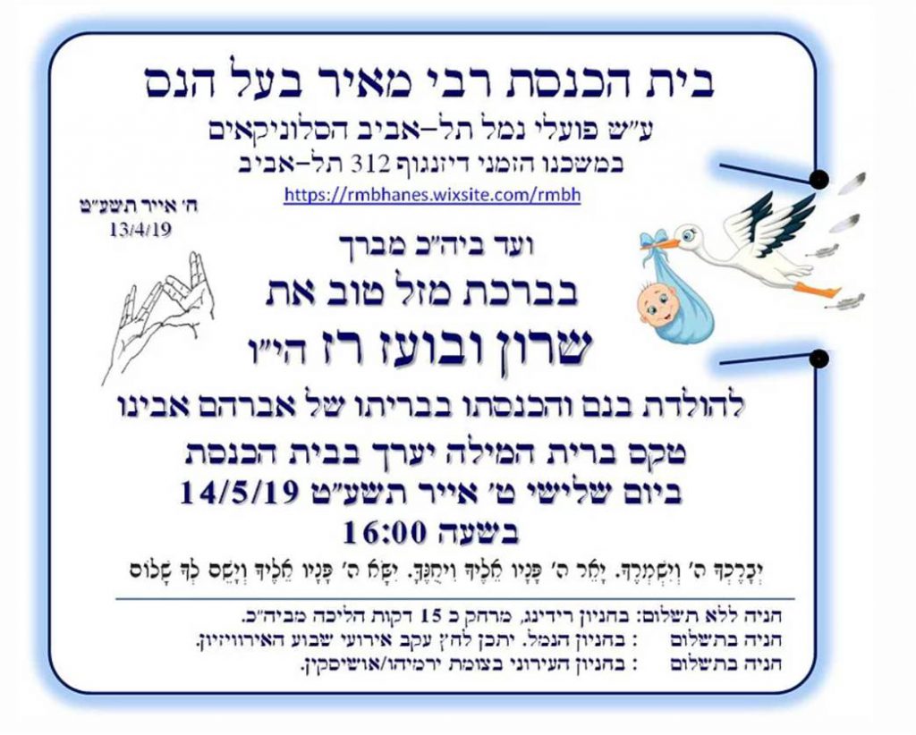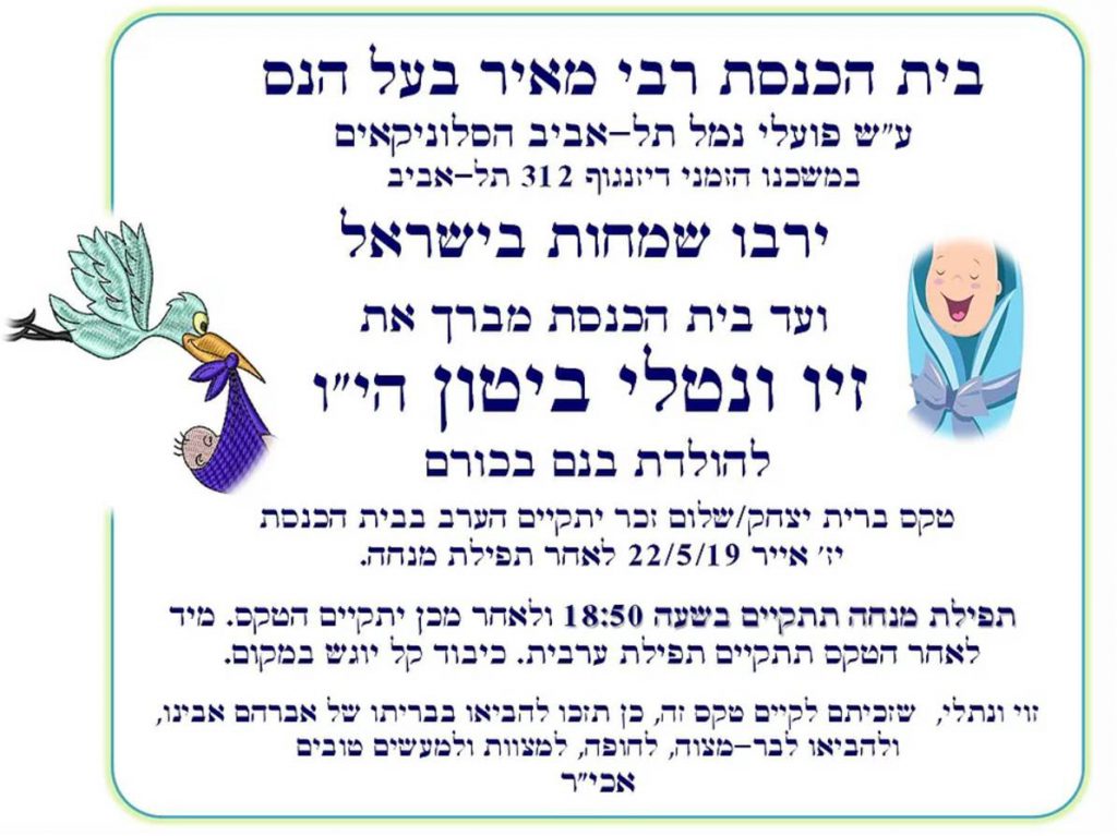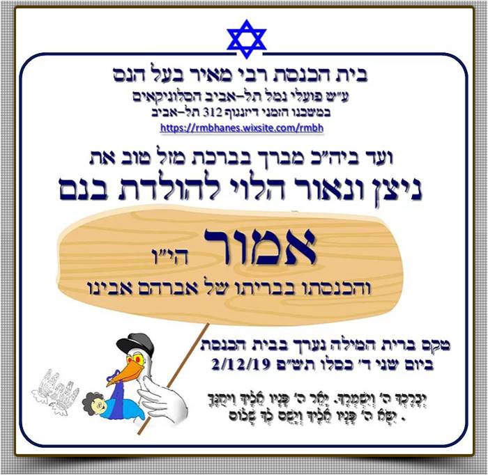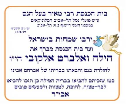 ביום רביעי יד’ ניסן תשע”ט 17/4/19 הכניסו אלברט והילה אלקובי הי”ו את בנם לבריתו של אברהם אבינו ויקרא שמו בישראל אברהם בן.