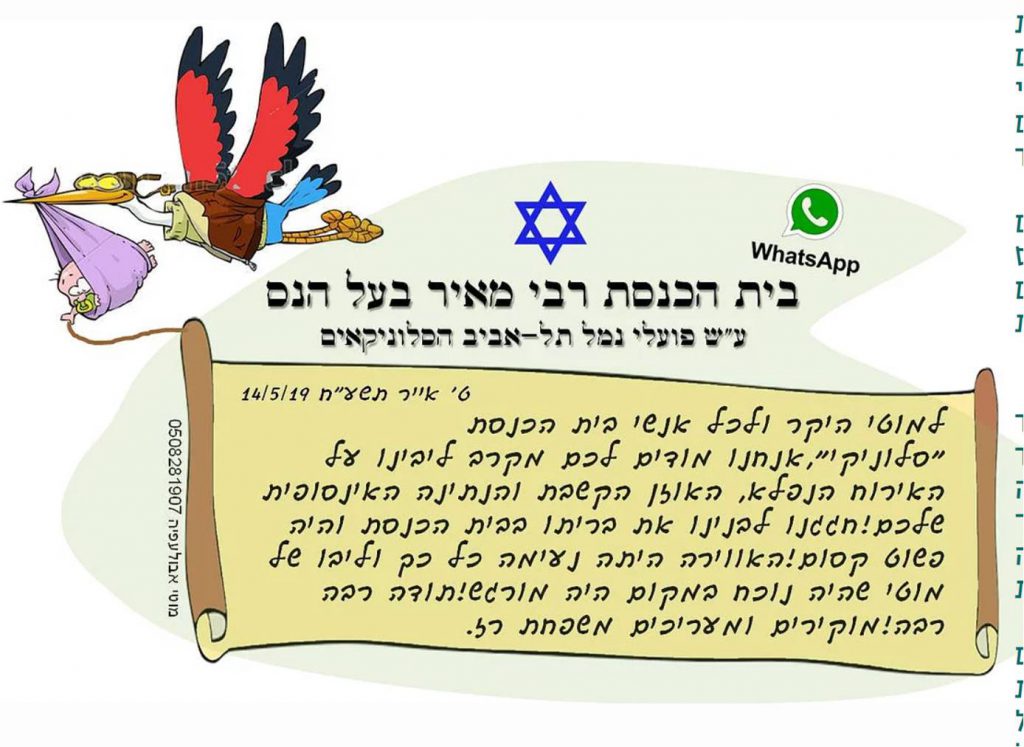 ביום שני ח’ אייר (13/5/19) התבקשנו לערוך טקס ברית מילה לרך הנולד לשרון ובועז רז. המועד, למחרת הפניה, יום ג’ ט’ אייר 14/5/19. לא היססנו לרגע ומיד פתחנו בהכנות לטקס. הוכנס מנקה אשר קירצף את אולם התפילה ומושבי בית הכנסת סודרו באופן שיתאים לקליטת כמה עשרות אורחים.