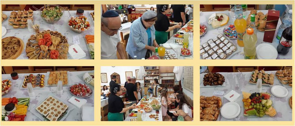 בתום התפילה הוגשה סעודת מצוה עשירה בה הוגשו מני מאפה, מלוחים ומתוקים, בורקסים ופיצות, סלטים שונים ובהם סלט ביצים, סלט טונה, סלט ירקות טריים, דגים מלוחים, לחמניות טריות, ביצים קשות ולקינוח הוגשו עוגות, עוגיות רוגלך, קינוחים מני מתיקה מוקרמים, שתיה קרה מתוקה ושוקו וכן שתיה חמה, קפה ותה.
