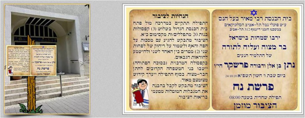 מועד העליה לתורה התקרב ובא, יום שבת ו’ חשון תשפ”א 24/10/2020 ופורסמה הקלה בהנחיות לציבור. מותרת התקהלות והתכנסות לתפילות במרחב הפתוח ובקפסולות בנות 20 מתפללים/ות כ”א. אז צץ הרעיון, לערוך את העליה לתורה ברחבה המדרכה ממול לדלתות בית הכנסת הגדול בקפסולות בהתאם להנחיות. מרחב המדרכה חולק לשלושה אזורים, 2 אזורי תפילה לגברים ואזור תפילה לנשים. דפנות סוכת בית הכנסת נעטפו בחלקן בפוליטילן והסוכה הוקצתה למתפללים גברים. האזור המערבי הוקצה לבנות המשפחה והאזור הצפוני לגברים. הכל בכדי לאפשר עריכת השמחה ובכדי לעמוד בדרישות משרד הבריאות. אכן, רעיון נפלא.
