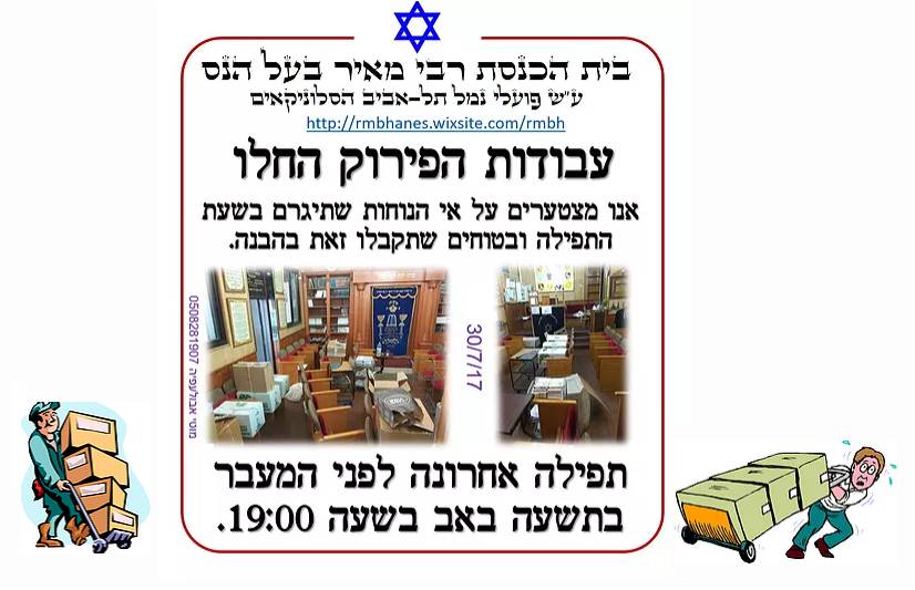 2-3/8/17 – פירוק ביה”כ ומעבר למשכן הזמני בביה”כ הגדול ברחוב דיזנגוף 312 בתל-אביב