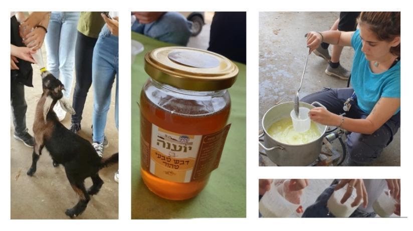 We also made cheese. First, we milked the goat. Second, we filled a bottle with the milk and fed the young goat. After that, we took the rest of the milk and put it in a pot and boiled the milk. We added to it yogurt, vinegar and salt. Finally we split it to small cups, and took of all the liquids from it.