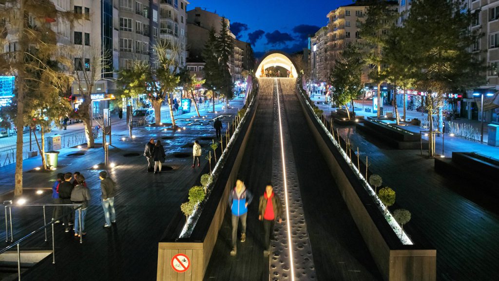 Hamamyolu Street interpreting its socio-cultural, historical and visual identity, to reintegrate it into the city. Odunpazarı district is known for its glass production workshops, where the local tradition of glass manufacture is still alive and active. Many artisans produce handcrafts which are exhibited and sold within the city. One of the inspiration and cultural link for Hamamyolu Project comes from this local glass production. One of the demands of the people of Eskişehir is to increase the number and variety of the café and seating areas in Hamamyolu. Various types of cafés are created and differentiated with their concept. Roofs of the cafés are covered with greenery and connected to the ground with steps which also work as multipurpose amphitheatre. One of the most prominent and enjoyed feature of the Hamamyolu Urban Deck is to become a fun environment, containing numbers of different playgrounds such as trampolines, stone pools, amphitheatres, etc. for different age groups. Other than the playgrounds and the facilities designed particularly for children, the whole urban deck itself becomes a playground for everyone with its three-dimensional use. Various playgrounds are integrated into Hamamyolu such that “play” is mixed with the natural flow of everyday life. “A free multipurpose art museum”, which is open to two sides, is designed in the middle of the bridge-passageway, establishing a “cultural link” to the city. Wooden sculptures designed by wood artists for International Wooden Sculpture Festival, and glass and ceramic works that are produced in Odunpazarı Glass Ateliers are being exhibited in this museum.