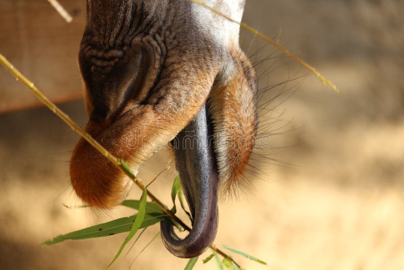 La giraffa ha una lingua molto muscolosa che usa per strappare le foglie dei alti degli alberi e portarle alla bocca. la lingua è lunghissima e ricoperta di saliva appiccicosa gli esemplari maschi, che preferiscono i rami più alti, riescono a estenderla fino a 50 cm. Però la caratteristica più curiosa della lingua della giraffa è il colore :è blu .Solo l’okapi, un animale della stessa famiglia delle giraffe, ha la lingua dello stesso colore e altrettanto lunga.