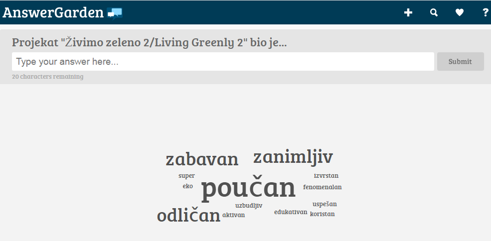 Od učenika je zatraženo da u dve reči opišu projekat. Za takav vid evaluacija poslužio nam je web-alat AnswerGarden.