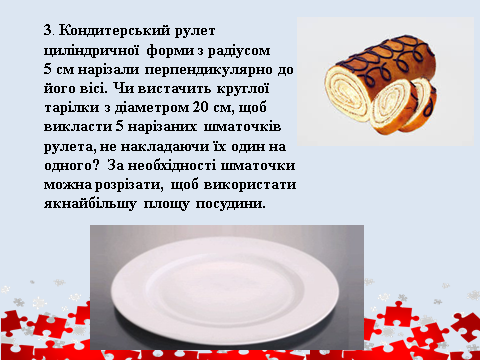 ондитерський рулет циліндричної форми з радіусом 5 см нарізали перпендикулярно до його вісі. Чи вистачить круглої тарілки з діаметром 20 см, щоб викласти 5 нарізаних шматочків рулета, не накладаючи їх один на одного? За необхідності шматочки можна розрізати, щоб використати якнайбільшу площу посудини