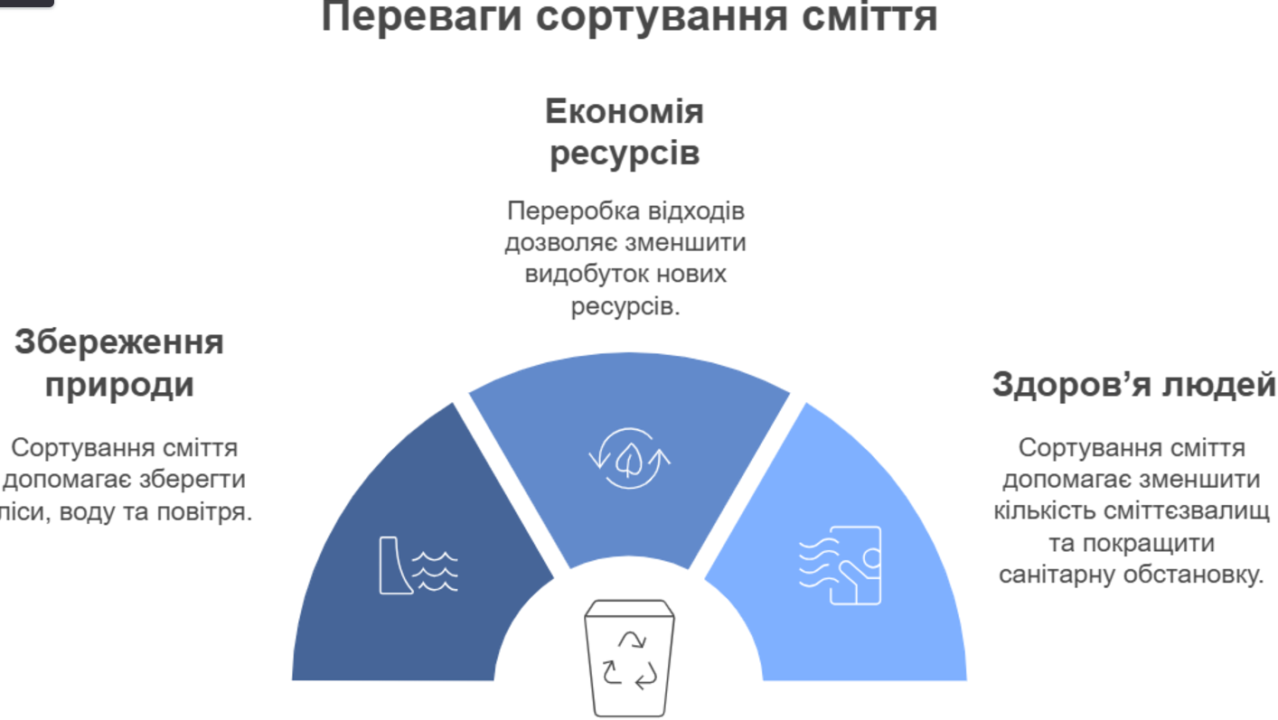 Сортування сміття – це процес розділення відходів на різні категорії (фракції) за матеріалом, з якого вони виготовлені. Це робиться для того, щоб їх можна було переробити та використати повторно.