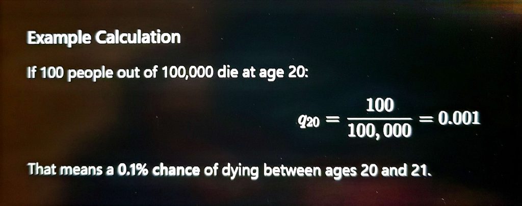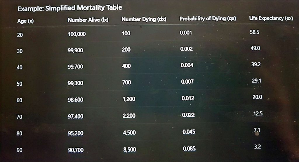 Another essential actuarial tool is called the ‘mortality table’, also known as the ‘life table’.