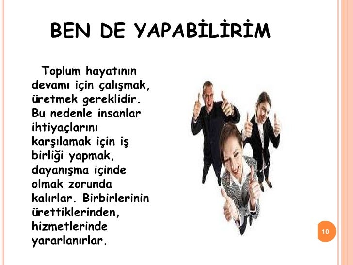 BEN DE YAPABİLİRİM Toplum hayatınındevamı için çalışmak,üretmek gereklidir.Bu nedenle insanlarihtiyaçlarınıkarşılamak için işbirliği yapmak,dayanışma içindeolmak zorundakalırlar. Birbirlerininürettiklerinden,hizmetlerinde yararlanırlar.