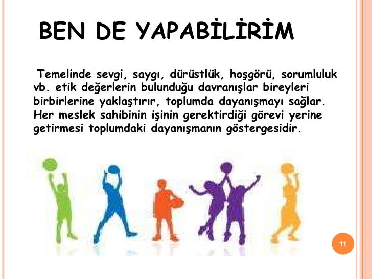 BEN DE YAPABİLİRİM Temelinde sevgi, saygı, dürüstlük, hoşgörü, sorumlulukvb. etik değerlerin bulunduğu davranışlar bireyleribirbirlerine yaklaştırır, toplumda dayanışmayı sağlar.Her meslek sahibinin işinin gerektirdiği görevi yerinegetirmesi toplumdaki dayanışmanın göstergesidir.