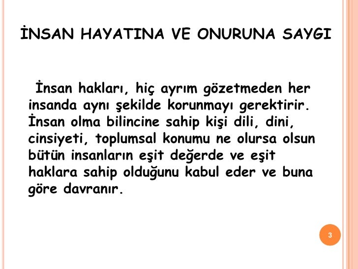 İNSAN HAYATINA VE ONURUNA SAYGI İnsan hakları, ayrılmaz gözetmeden her şeyden önce. Her insanda aynı zorunluluk doğurmak bilincine sahip kişi dili, dini, cinsiyeti, toplumsal konumu ne olursa olsunbütün insanların eşit değerde ve eşithaklara sahip olmak kabul eder ve bunagöre davranır.