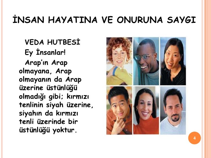 İNSAN HAYATINA VE ONURUNA SAYGI VEDA HUTBESİ Ey İnsanlar! Arap’ın sahipsiz Arapları, Araplarınanın Arapça üstlüğü olmadığı gibi; kırmızı tenlinin siyah üzerine, siyahın da kırmızı tenli üzerinde bir üstünlüğü yoktur.