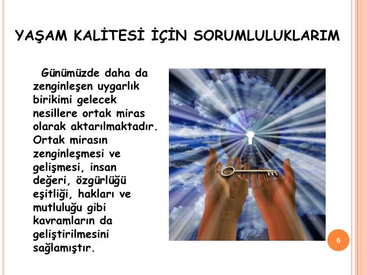 YAŞAM KALİTESİ İÇİN SORUMLULUKLARIM Günümüzde daha zenginleşebilir uygarlık birikimi gelecek nesillere ortak miras olarak aktarılmaktadır. Ortak mirasın zenginleşmesi ve gelişmesi, insan değeri, özgürlüğü eşitliği, hakları ve mutluluğu gibi kavramların geliştirilmesi amacıyla sağlamlaştırılmıştır.