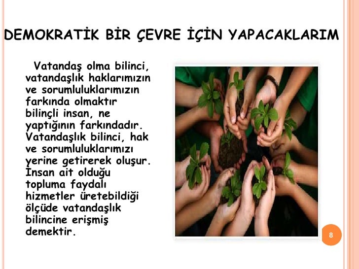DEMOKRATİK BİR ÇEVRE İÇİN YAPACAKLARIM Vatandaş’ın vatandaşlık haklarımızın ve sorumluluklarımızın farkında olmaktır bilinçli insanı, ne yaptığının farkındadır. Vatandaşlık bilinci, hak ve sorumluluklarımızı yerine getirerek oluşur. Insanlığın topluma yararlı hizmetleri üretebildiği şekilde vatandaşlık bilincine erişilmiş demektir.