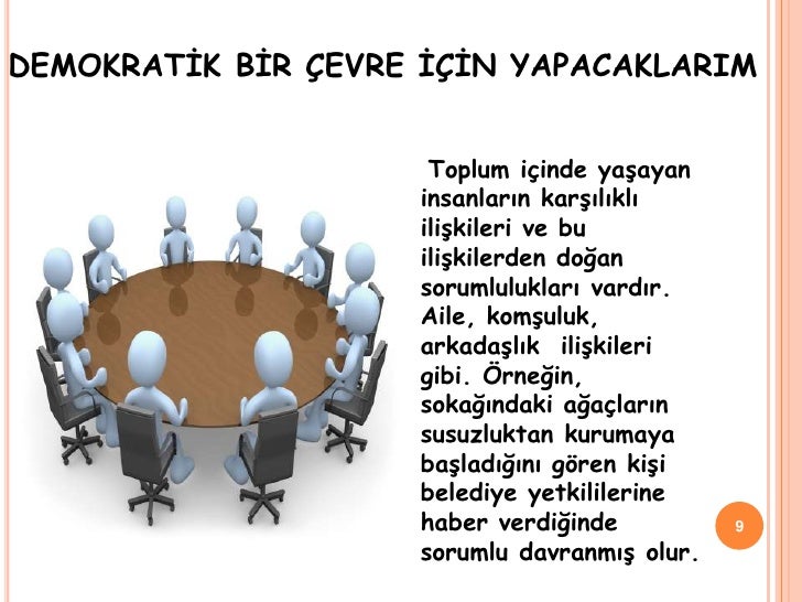 DEMOKRATİK BİR ÇEVRE İÇİN YAPACAKLARIM Toplum içinde yaşayan insanların karşılıklı ilişkileri ve bu ilişkilerden doğan sorumlulukları vardır. Aile, komşuluk, arkadaşlık ilişkileri gibi. Örneğin, sokağındaki ağaçların susuzluktan kurumaya başladığını gören kişi belediye yetkililerine haber verdiğinde sorumlu davranmış olur.