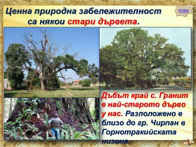 19. 22. Ценна природна забележителност са някои стари дървета. план Дъбът край с. Гранит е най-старото дърво у нас. Разположено е близо до гр. Чирпан в Горнотракийската низина.
