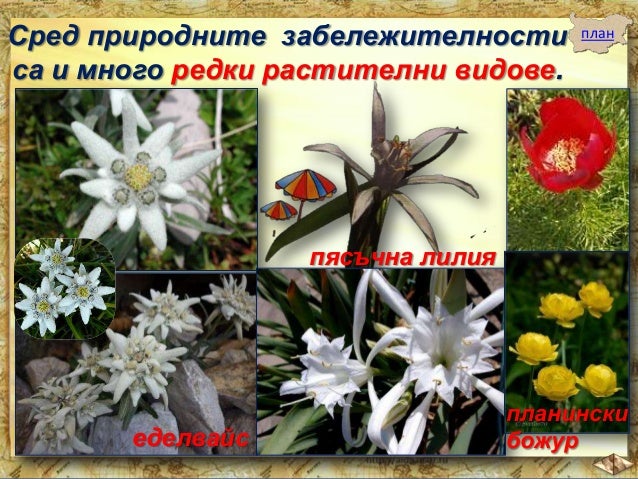 22. 25. Сред природните забележителности са и много редки растителни видове. план пясъчна лилия еделвайс планински божур