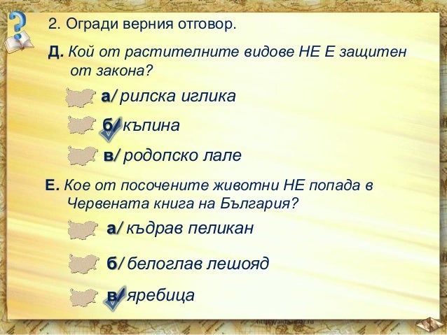 31. 34. 2. Огради верния отговор. Д. Кой от растителните видове НЕ Е защитен от закона? а/ рилска иглика б/ къпина в/ родопско лале Е. Кое от посочените животни НЕ попада в Червената книга на България? а/ къдрав пеликан б/ белоглав лешояд в/ яребица