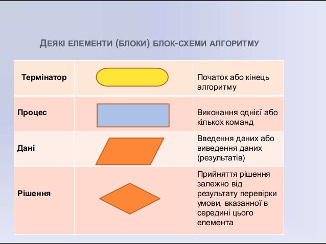 1-й тип — графічні фігури, кожна з яких відображає один з етапів процесу рішення задачі та містить у собі текст відповідної команди;