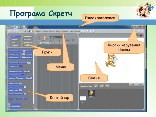 Вікно програми Скретч має складові, подібні до вікон програм, які ми вже вивчали: рядок заголовка, меню, кнопки управління вікном тощо