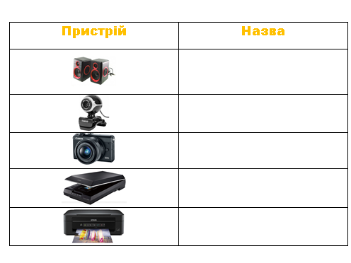 | Колонки, принтер, проектор, мультимедійна дошка, сканер, фотоапарат, відеокамера, веб-камера. |
