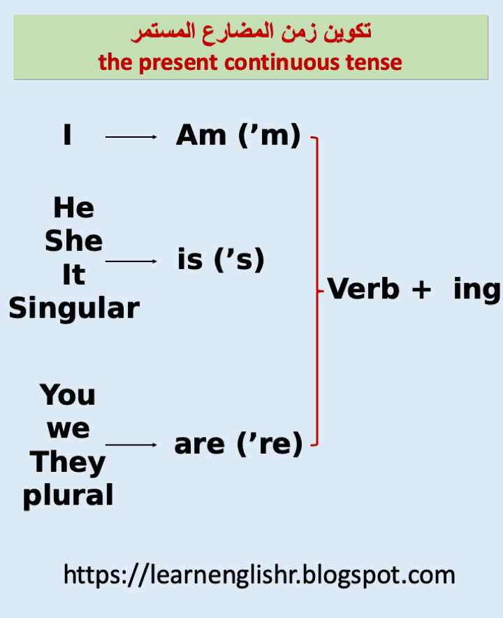 يتكون الفعل في زمن المضارع المستمر من جزأين هما: صيغة المضارع من الفعل to be + اسم الفاعل للفعل الرئيسي